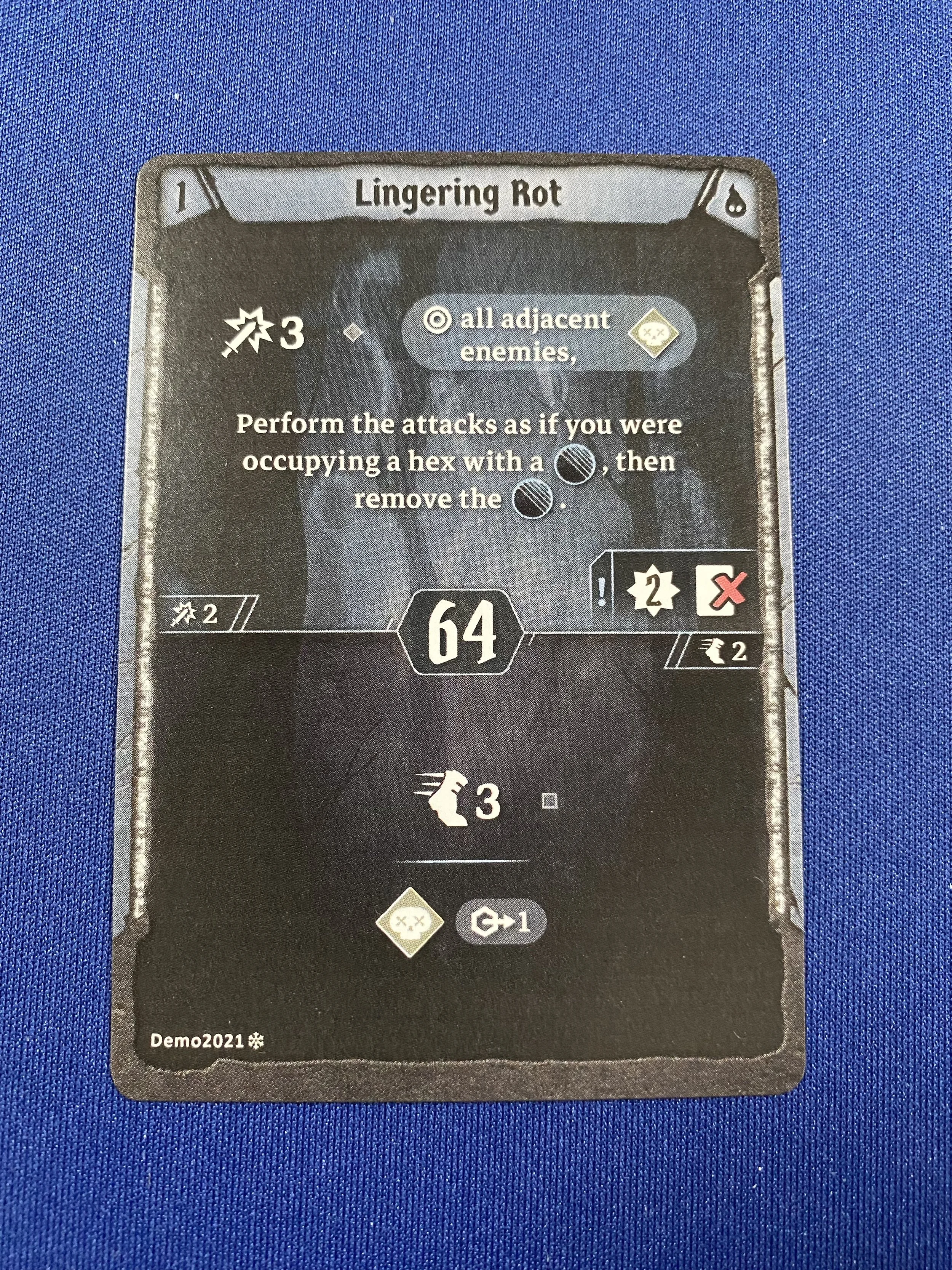 A three damage area of effect attack, hitting up to three targets in a three hex pattern up to three hexes away from your character. That’s a lot of threes. You also get to curse any enemies that you hit, put a dark element on the board and grab an experience point.